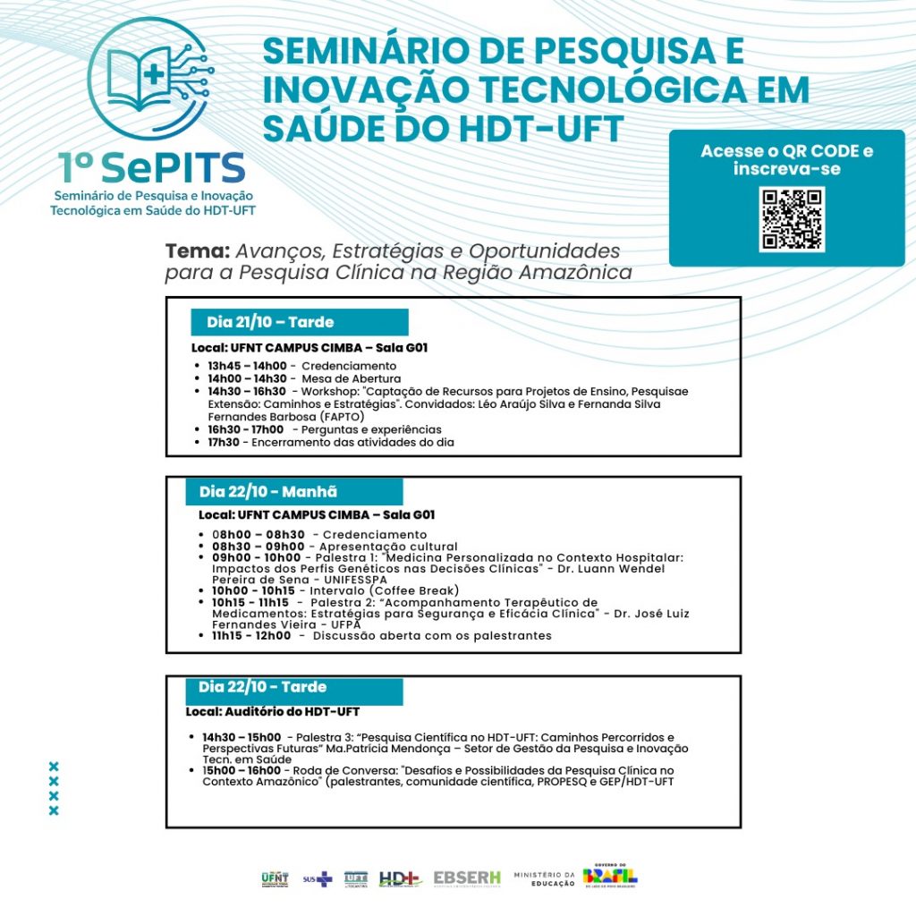 Na parte da tarde, a programação segue no Auditório do HDT, com a palestra “Pesquisa Científica no HDT-UFT: Caminhos Percorridos e Perspectivas Futuras”, ministrada por Ma. Patrícia Mendonça, chefe do Setor de Gestão da Pesquisa e Inovação Tecnológica em Saúde do HDT. O seminário será encerrado com uma roda de conversa sobre os “Desafios e possibilidades da pesquisa clínica no contexto amazônico”, reunindo palestrantes, comunidade científica e grupos de pesquisa.