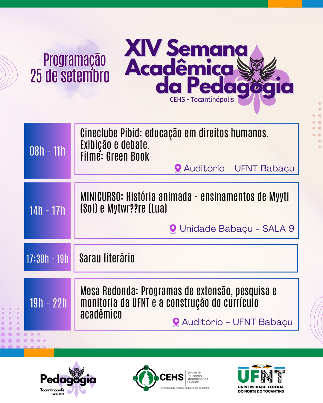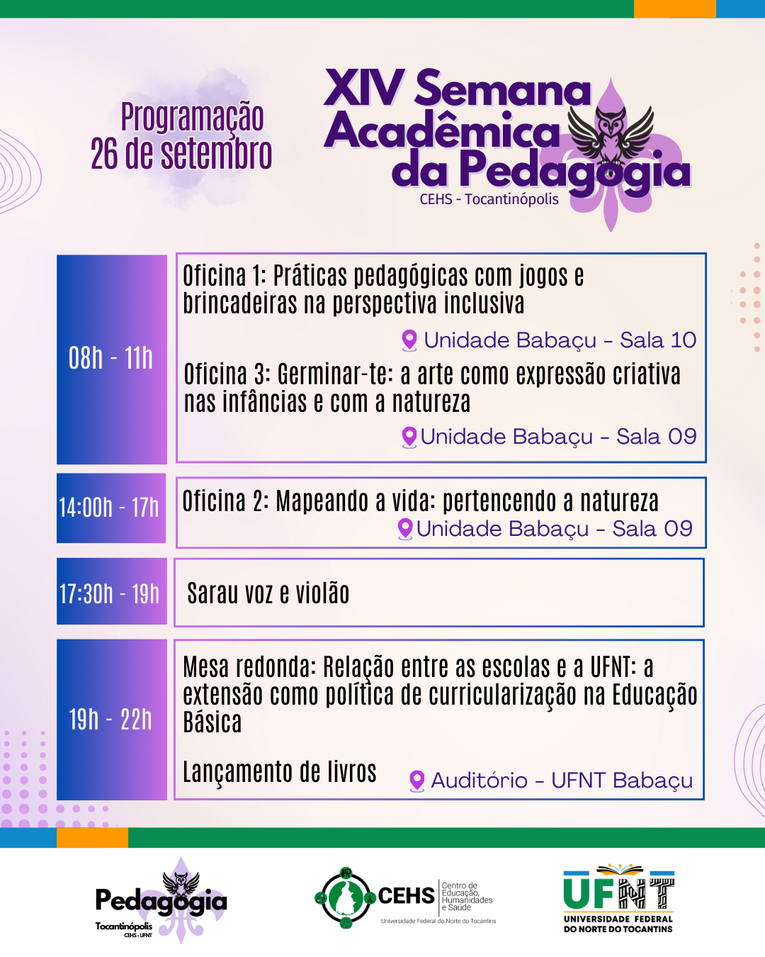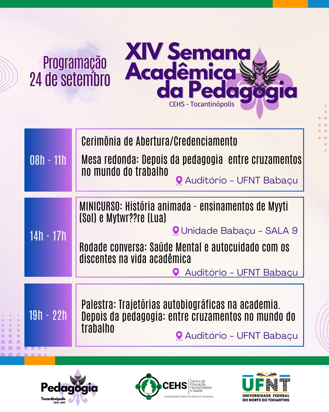 Por fim, vale destacar que a XIV Semana Acadêmica do Curso de Licenciatura em Pedagogia do CEHS/UFNT foi organizada com importante contribuição do corpo discente, que manifestou seus interesses. Da mesma forma, com diálogo franco com as escolas e, destacando, apresentando uma nova fase do Curso com seu Programa de Pós-Graduação em Educação.