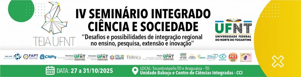 A Universidade Federal do Norte do Tocantins (UFNT) prorrogou até a próxima segunda-feira (13) o prazo para submissão de trabalhos no IV Seminário Integrado Ciência e Sociedade – TEIA UFNT 2025, que será realizado de 27 a 31 de outubro nas unidades da UFNT em Tocantinópolis (Unidade Babaçu) e Araguaína (Centro de Ciências Integradas – CCI).