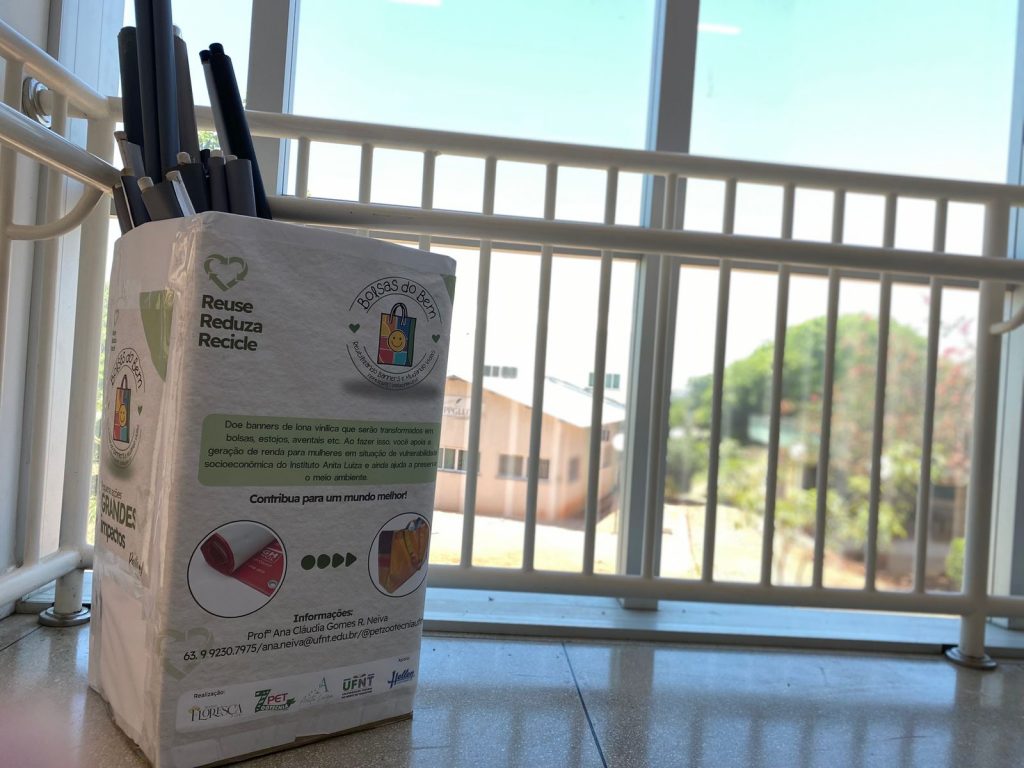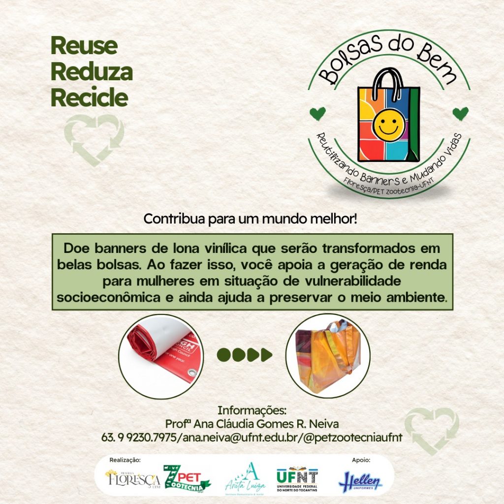 Araguaína (TO) — A Universidade Federal do Norte do Tocantins (UFNT) segue mobilizando sua comunidade acadêmica em torno do projeto de extensão “Bolsas do Bem: reutilizando banners e mudando vidas”, coordenado pela professora Ana Cláudia Neiva, do curso de Zootecnia. A iniciativa convida toda a comunidade acadêmica e as empresas da cidade a doar banners de lona vinílica usados, que serão reaproveitados na confecção de bolsas, estojos, necessaires, aventais e outros produtos criativos.