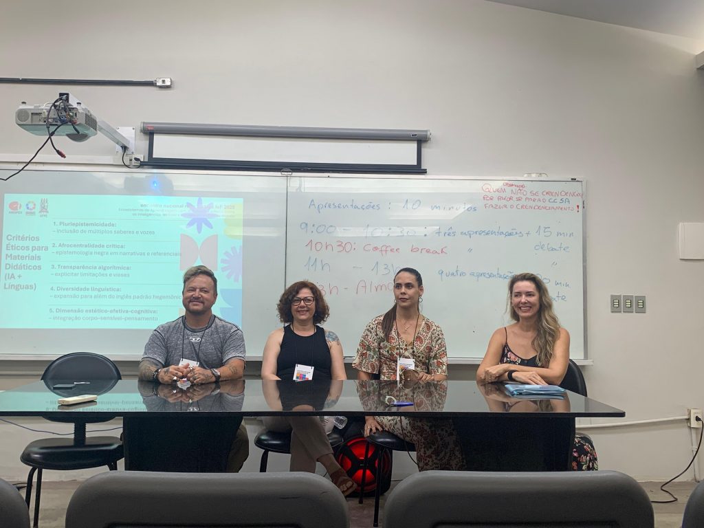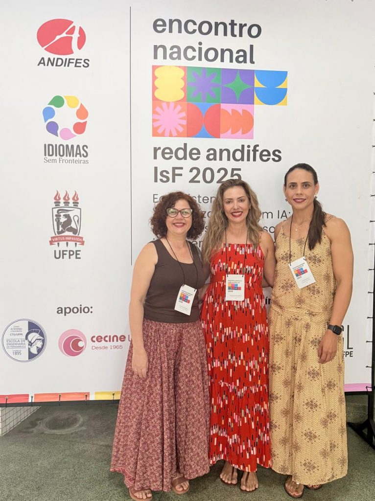 Entre os dias 26 e 28 de novembro, as docentes Alessandra Cristina Rigonanto, Elisa Borges de Alcântara e Naiana Siqueira Galvão, participaram do Encontro Nacional da Rede Andifes IsF 2025 – Ecossistemas de Aprendizagem com IA, realizado em Recife. A programação reuniu representantes de Núcleos de Línguas (NucLis) de universidades de todo o país para discutir tendências, práticas pedagógicas e desafios relacionados ao uso de Inteligência Artificial (IA) no ensino de línguas.
