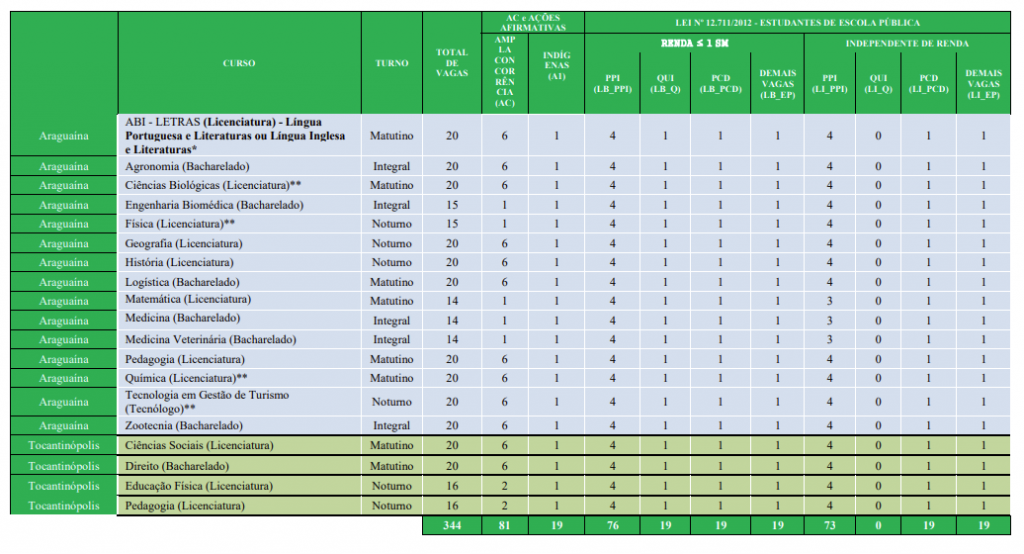 As vagas são distribuídas entre ampla concorrência, reserva de vagas conforme a Lei nº 12.711/2012 (Lei de Cotas) e Ação Afirmativa própria da UFNT, que destina 5% das vagas à inclusão de estudantes indígenas. O edital detalha ainda os critérios específicos para cada modalidade, incluindo exigências de renda, procedência escolar, autodeclaração étnico-racial e comprovação de deficiência, quando aplicável.