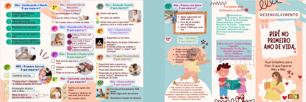 O processo de elaboração envolveu pesquisa em fontes oficiais e reconhecidas, como o Manual de Orientação sobre Desenvolvimento Infantil da Sociedade Brasileira de Pediatria, a Caderneta da Criança do Ministério da Saúde e diretrizes de estimulação precoce. Após essa etapa, o conteúdo foi adaptado para uma linguagem clara e acessível ao público leigo, organizado de forma cronológica e estruturado em formato de folder com dobras, facilitando a leitura e a distribuição. Ilustrações e ícones foram incorporados para ampliar a compreensão visual e tornar o material mais didático.