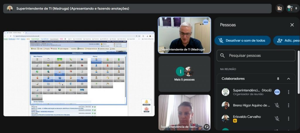 A equipe da Superintendência de Tecnologia da Informação da Universidade Federal do Norte do Tocantins (STI/UFNT) reuniu-se nesta quarta-feira (11) de forma remota, com o professor Marcus Cesar Madruga Alves Pinheiro, superintendente de Tecnologia da Informação da Universidade Federal do Rio Grande do Norte (UFRN), instituição responsável pelo desenvolvimento e manutenção do ecossistema de sistemas integrados conhecido como SIG-UFRN.
