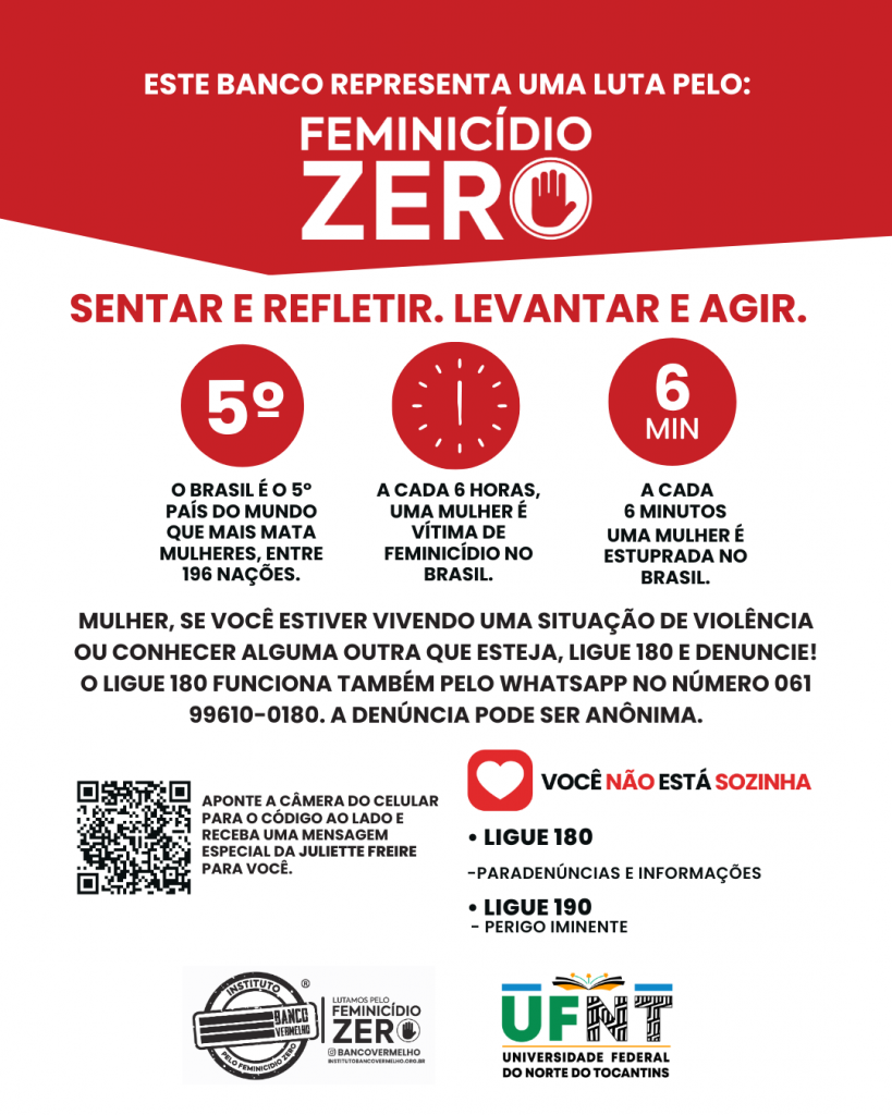 Na UFNT, o banco será acompanhado por uma placa informativa com dados sobre a violência contra a mulher e orientações sobre como buscar ajuda. Entre os canais divulgados estão o Ligue 180, central de atendimento à mulher em situação de violência, e o 190, para situações de emergência.