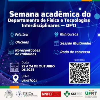 I SEMANA Acadêmica do departamento de física e tecnologias interdisciplinares – DFTI 22 ao 24 de outubro de 2025 Inscreva-se QUARTA-FEIRA, 22/10 QUINTA-FEIRA, 23/10 SEXTA-FEIRA, 24/10 08h-9h00 Palestra: Perspectivas de Pesquisa em Ensino de Física. Prof. Dr. Jaime Zanolla. Sala G01 Roda de Conversa: Introdução ao Spin e Superposição Quântica. Prof. Dr. Matheus Lobo.